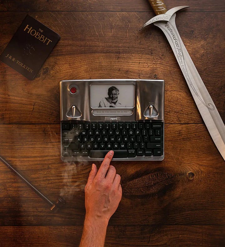 Regrettably, my ideal device doesn't exist, but the Freewrite comes close. This distraction-free smart typewriter is crafted specifically for writers. Its sole purpose is to aid you in focusing on drafting without distractions or interruptions. Featuring an E Ink screen and devoid of unnecessary apps and bloatware, the Freewrite allows you to concentrate exclusively on your writing. What I love most is its mechanical keyboard, which looks vastly more enjoyable to type on compared to the standard keyboards that come with a MacBook. Below you’ll find images of Freewrite’s most lavish model — The Hemingwrite. You have to admit it looks impressive.